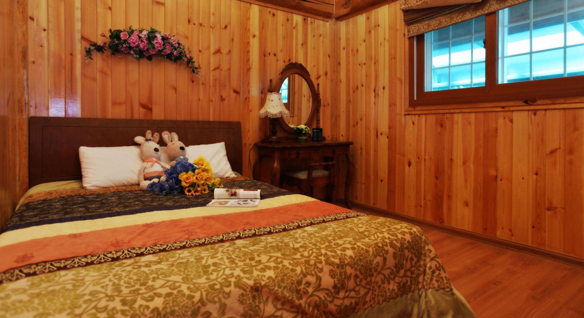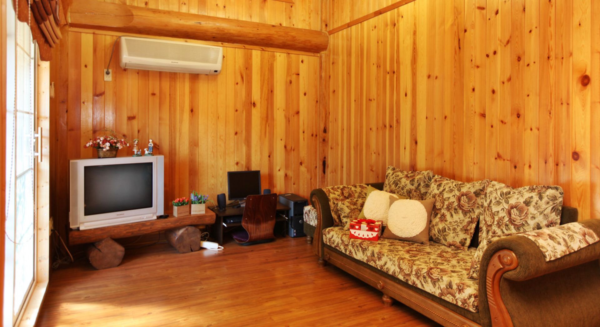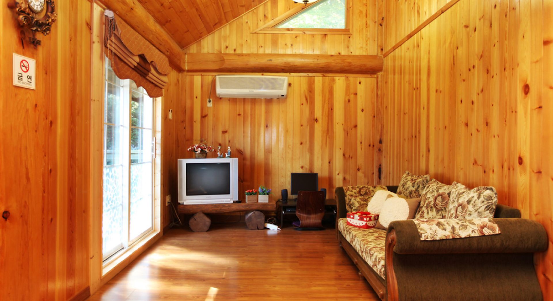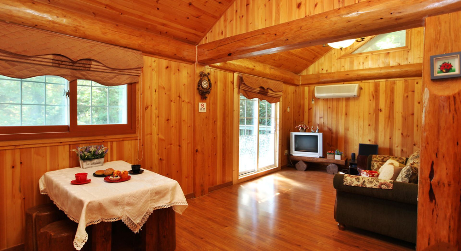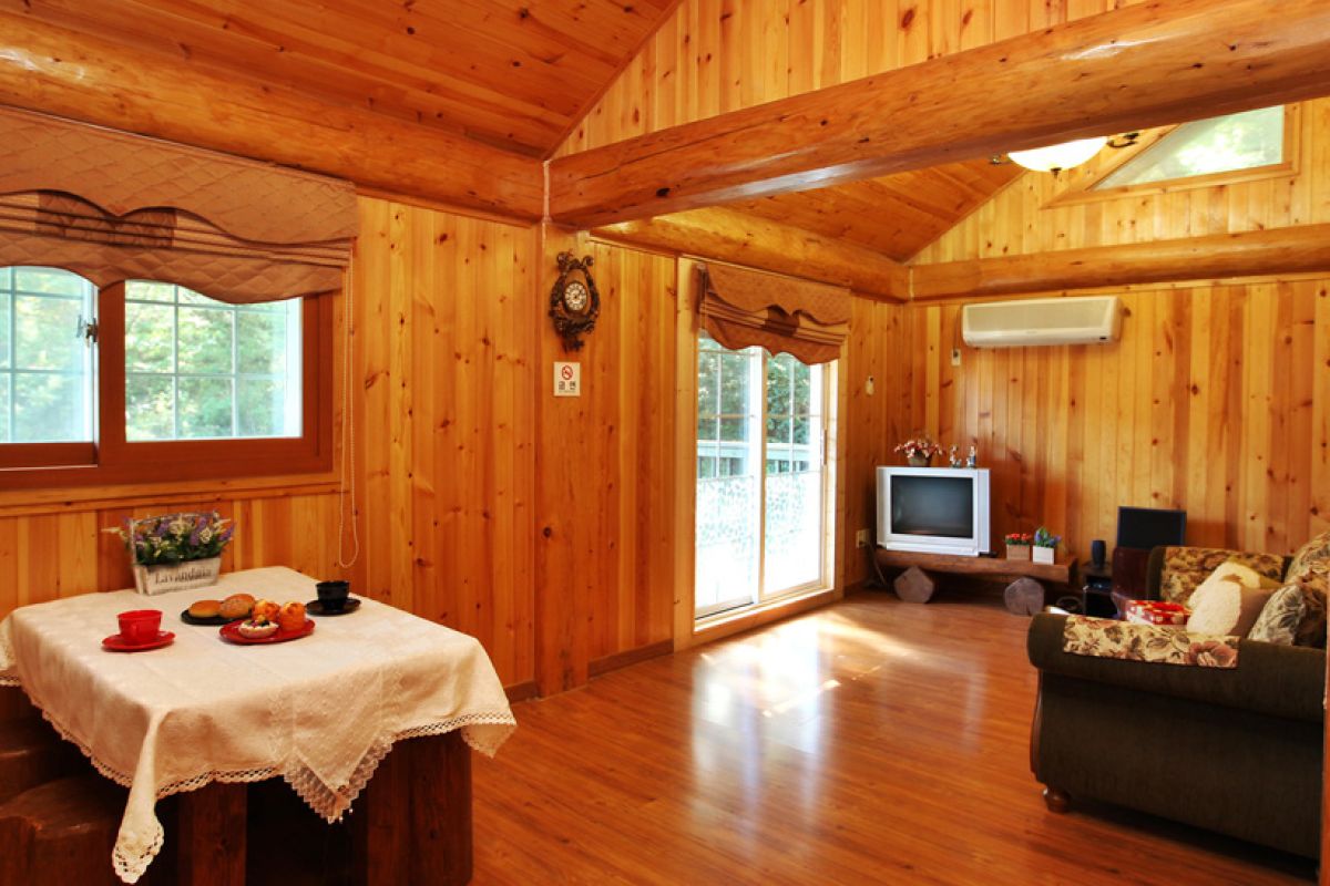20평형으로 가족단위 이용객들에게 좋습니다. 천정 가까이 나 있는 창이 기분좋은 객실, 설천입니다.