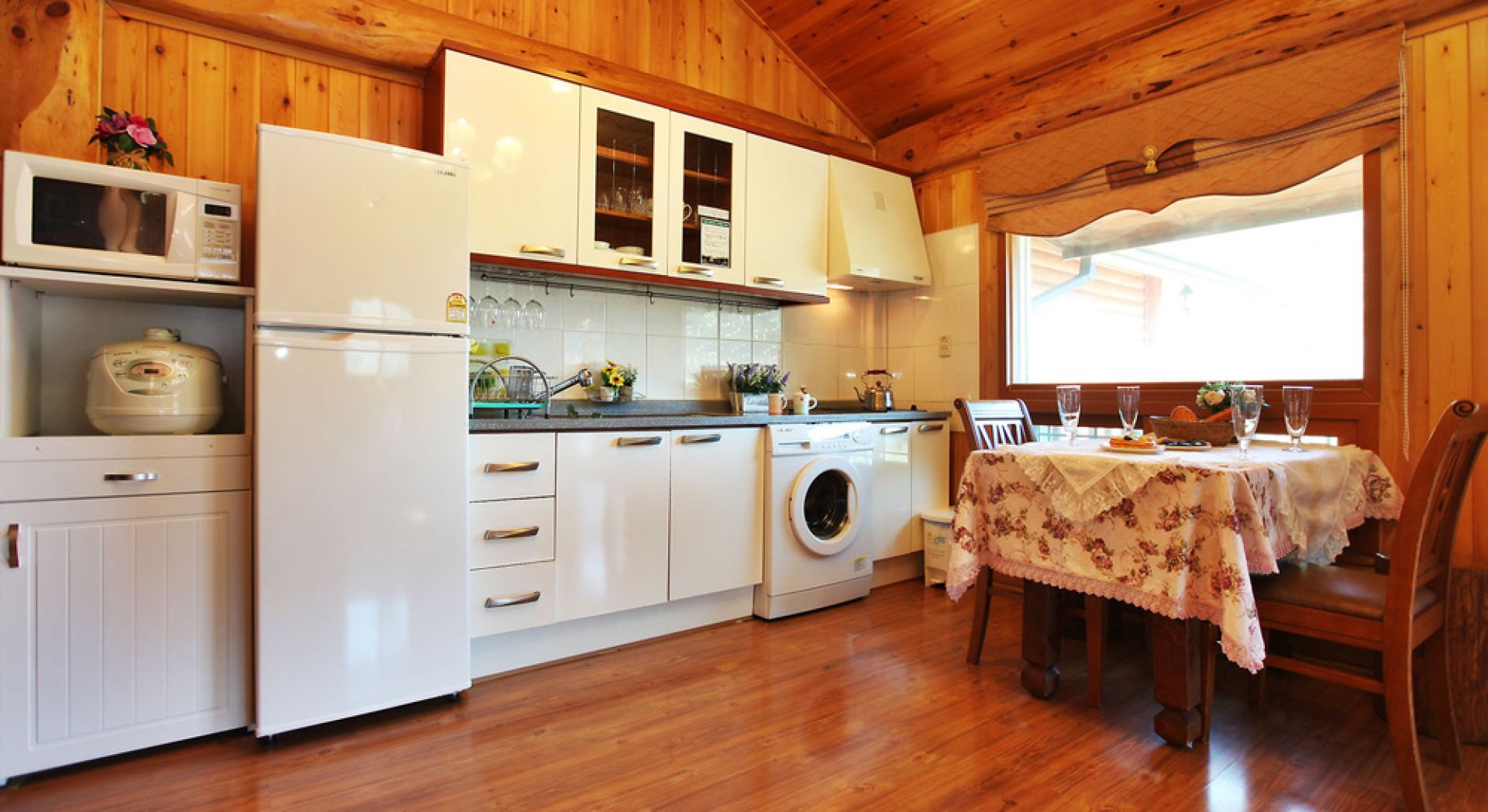 - 시설 : TV, 침대, 식탁, 에어컨, 냉장고, 선풍기, 세탁기, 가스렌지, 드라이기, 취사, 전기밥솥, 컴퓨터, 전자레인지, 욕실용품, 비데 등